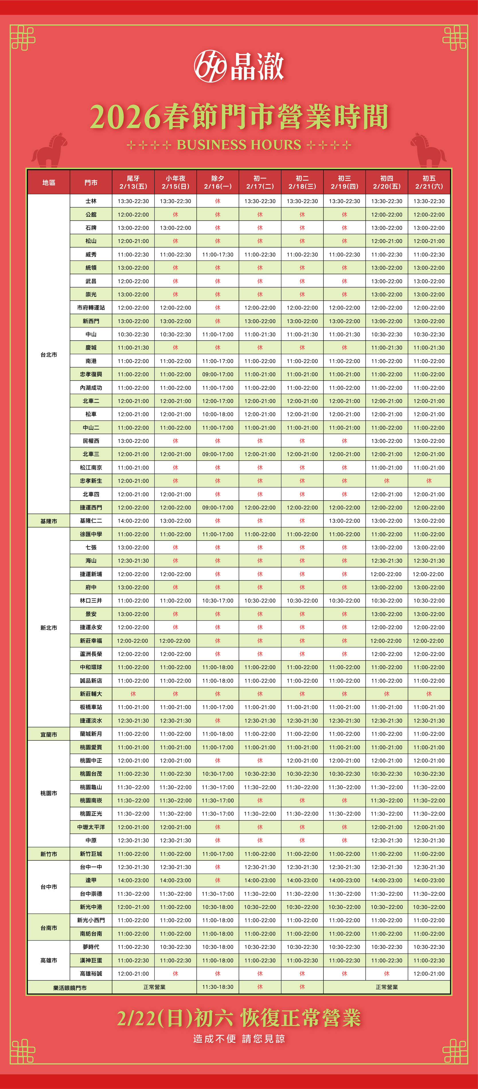 春節期間門市營業公告